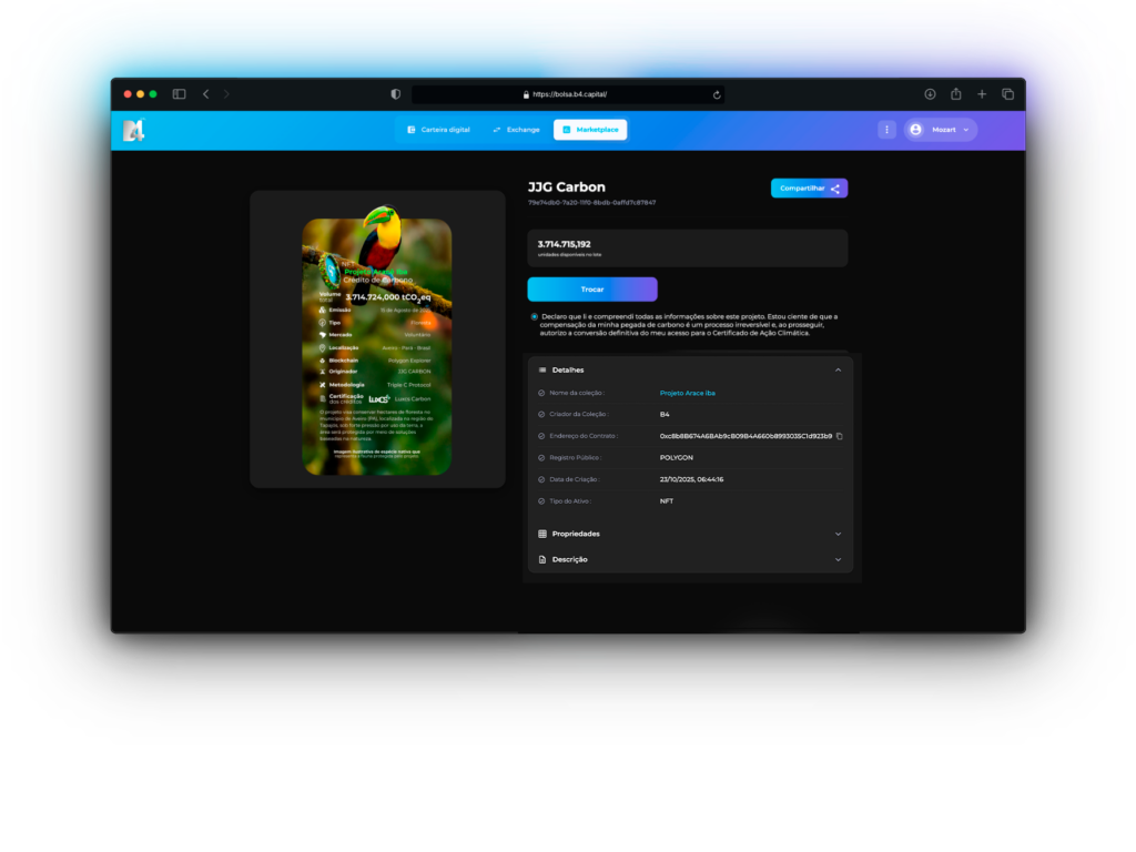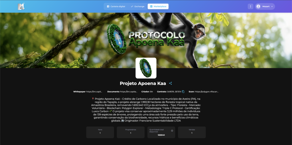 Página do Certificado de Crédito de Carbono em formato NFT Listado no Marketplace da B4
